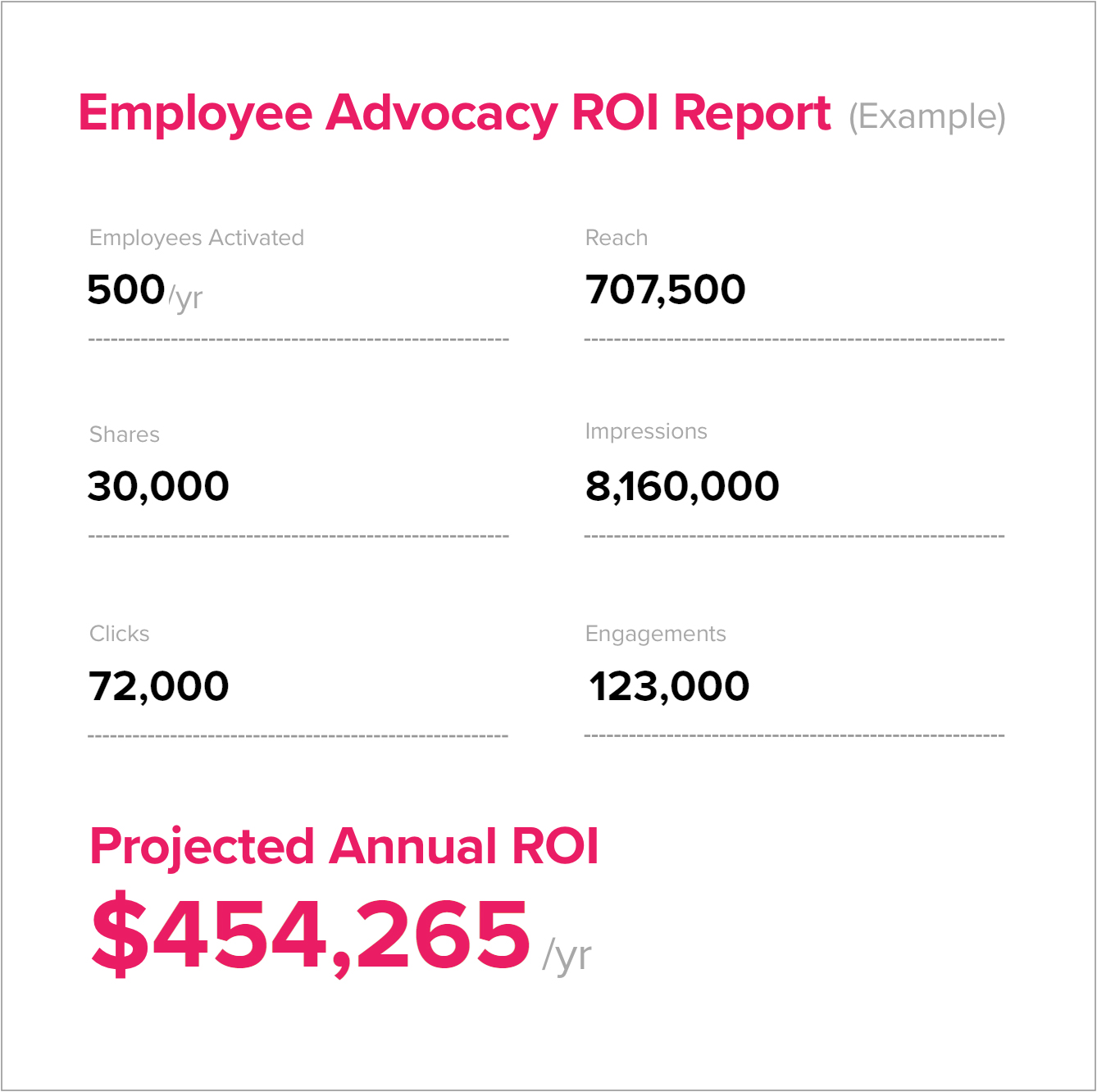 Our ROI report will provide a projection of the dollar value your program will generate over the first 12 months along with a number of other key metrics including reach, shares, impressions, clicks, and engagements.