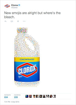 The Twitter account of Clorox sent out a tweet with a Clorox bleach bottle, the bottle was a mosaic comprised of emojis. They accompanied the image with the caption, “New emojis are alright but where’s the bleach.”