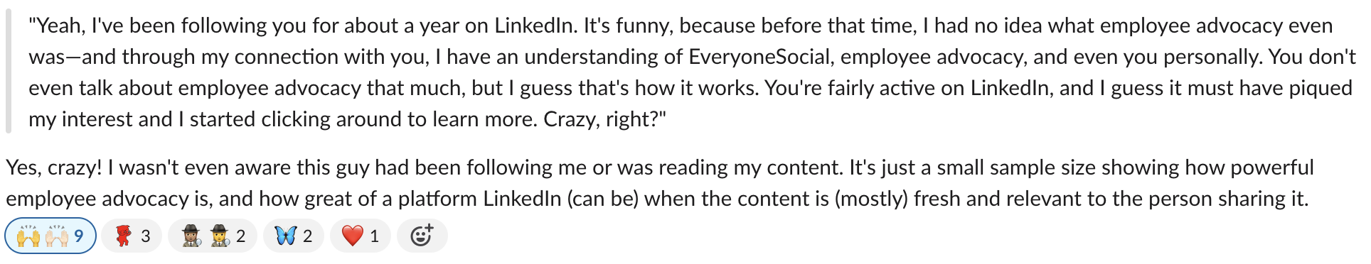 The employee who shared this experience is an active LinkedIn user with more than 2,000 followers, and he consistently posts great content. So it doesn’t surprise me to hear that this applicant follows him and gained insights into employee advocacy through that connection.