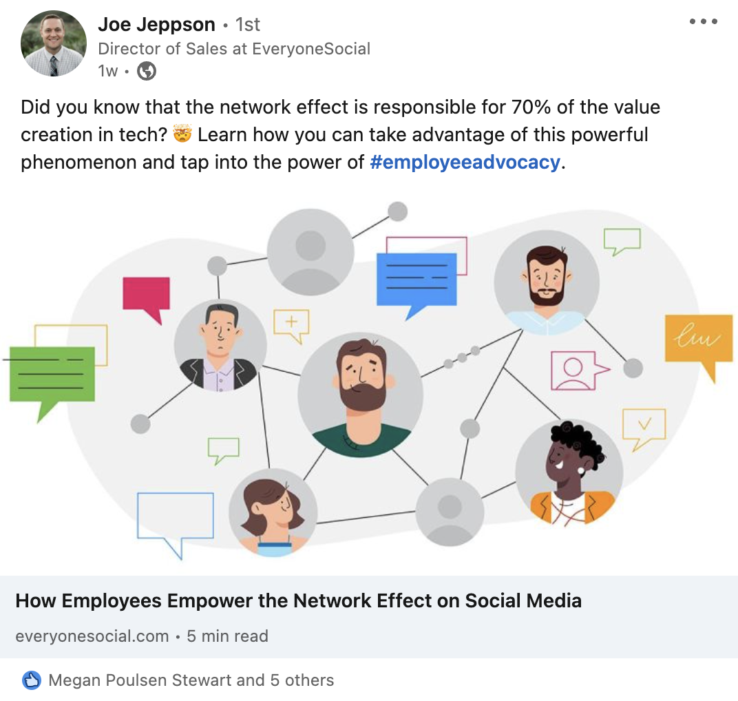 Engagement can be anything from liking a colleague’s announcement about a new job to leaving a comment on a prospect’s post when they share a win. It can also take the form of participating in discussions or tagging someone in a comment and asking them to weigh in on something you’ve shared.