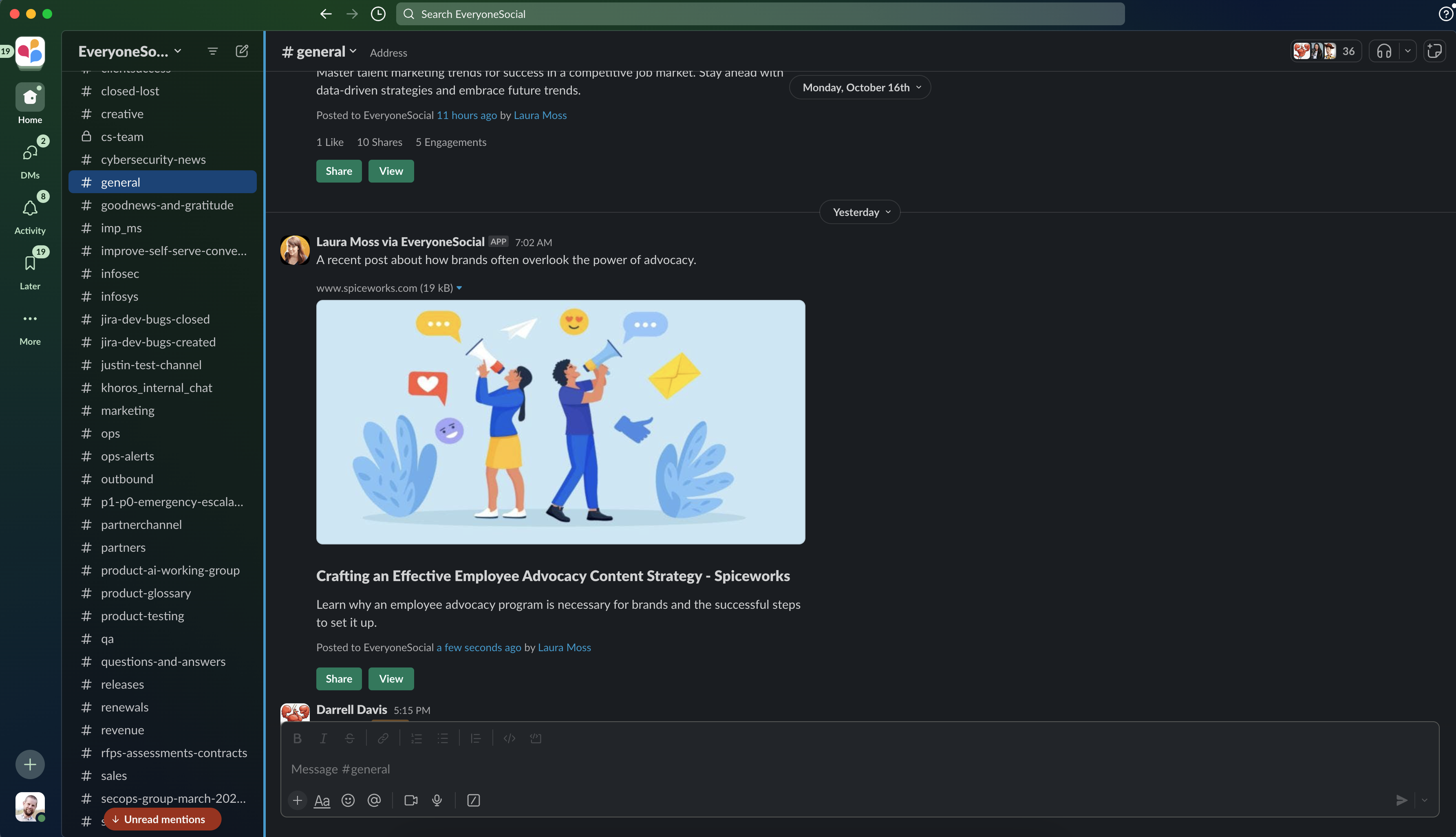 The Slack integration allows users to send EveryoneSocial posts directly to the channels they’ve joined, interact with post content natively, and share any shareable content right from Slack.