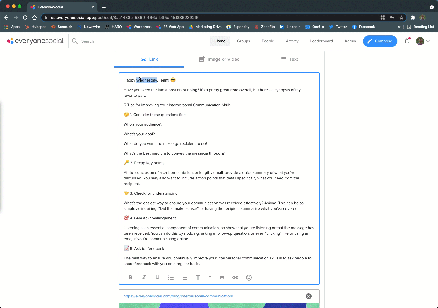 Regular users can use rich text formatting while composing or editing an EveryoneSocial post while Admins can also apply it elsewhere, like within Content Emails or Internal Messages.
