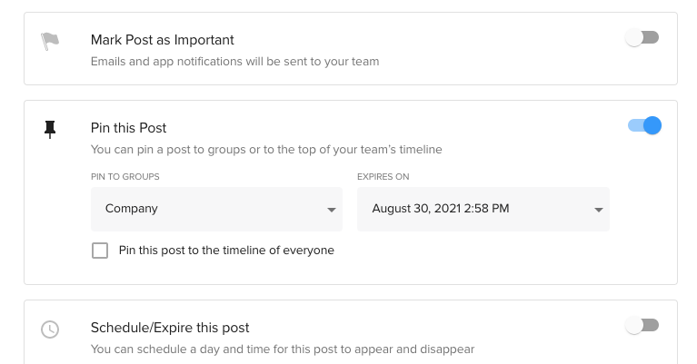 If you’re posting something really important, like a message from the CEO to the whole company, you can certainly still select the box to pin it to everyone’s timeline! The idea here is just to prevent that from happening by accident.