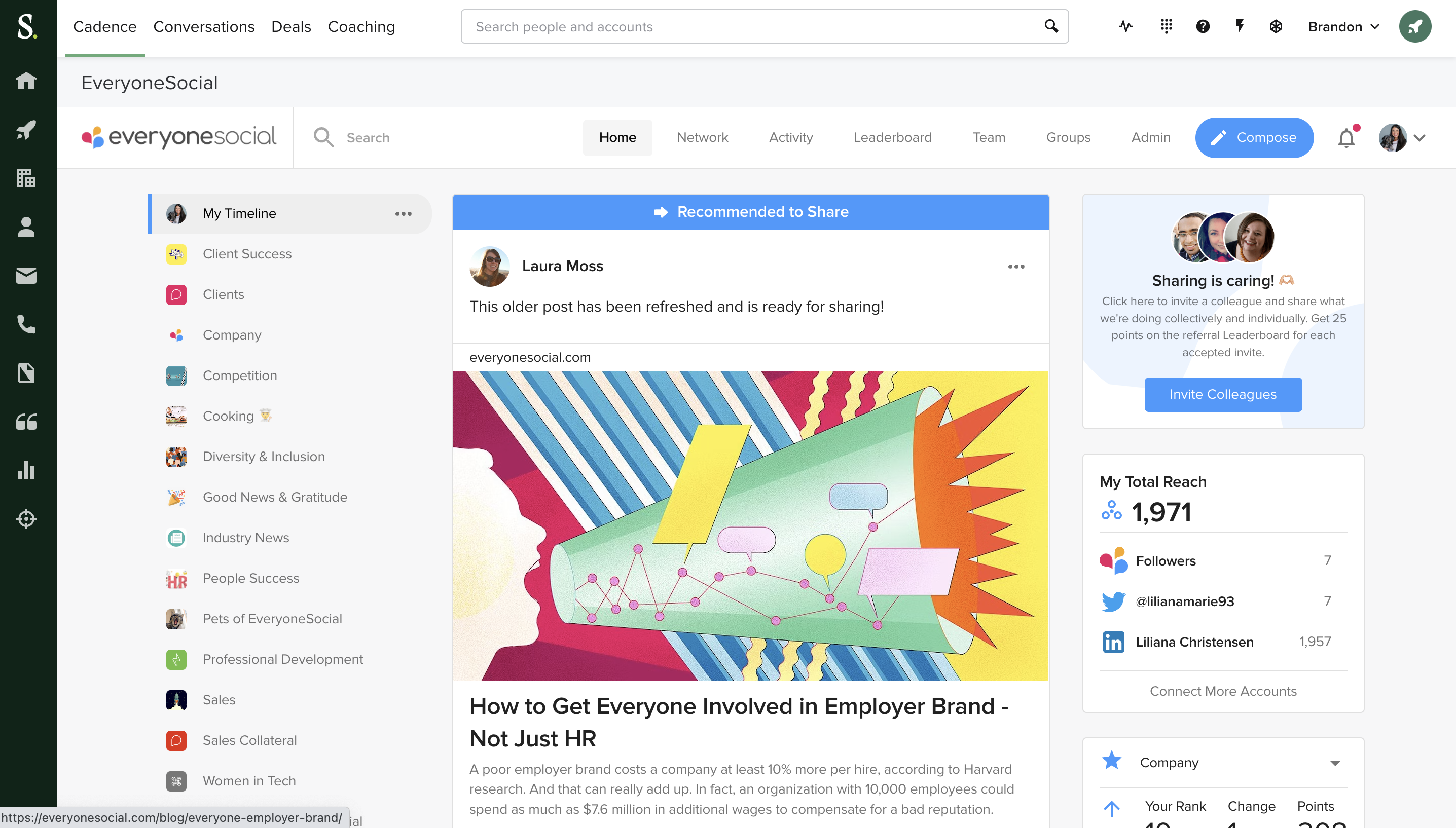 Sellers are powerful players in any advocacy program, so we’ve brought the full power of EveryoneSocial right to where your salespeople spend most of their day.