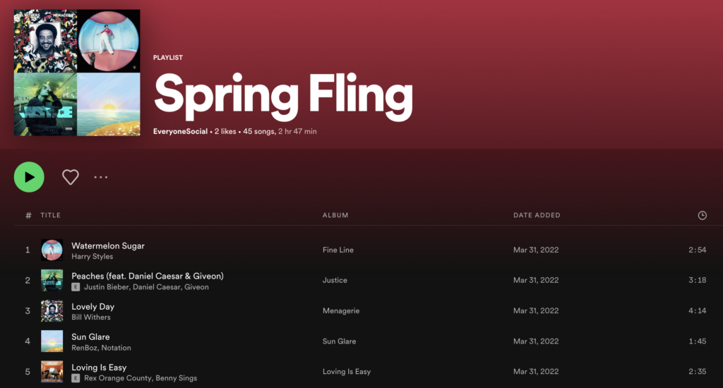 Here at EveryoneSocial, we do this each quarter and provide seasonal prompts for the playlists such as “campfire songs” and “spring fling.”