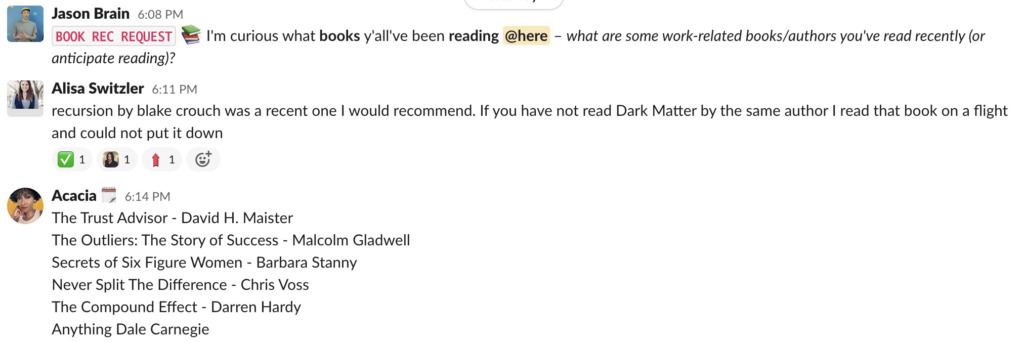 A book club allows for remote teams to mingle and socialize while also engaging in critical thinking and sharing different opinions.
