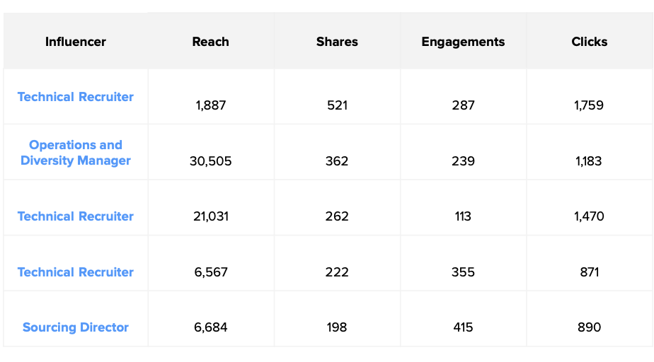This table showcases the results generated over one quarter by this Fortune 50 company’s top sharers, many of which are involved in recruitment and talent sourcing. Clearly, they know the value of sharing company content to enhance employer brand!