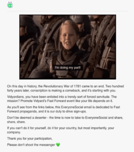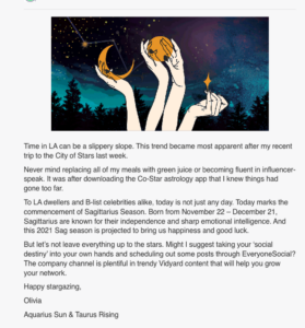 Olivia expertly finds ways to connect these seemingly random topics back to what’s important: getting her users into EveryoneSocial and working their social-selling magic.