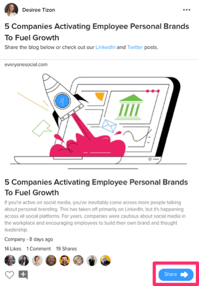Start by simply asking your up-and-coming influencers to share. Pick a piece of content in your workspace and tell your people you’d like them to share it.